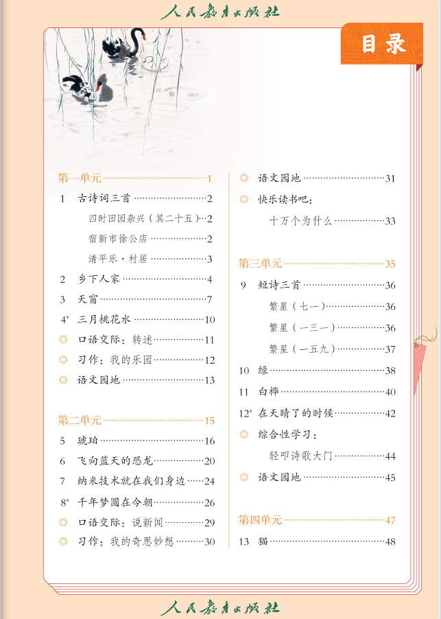 人民教育出版社,是教育部所属的一家大型专业出版社,从事基础教育教材的研究、编写、编辑、出版与发行。下面是小编为大家整理的人教版四年级语文下册电子课本(高清),希望对您有所帮助!